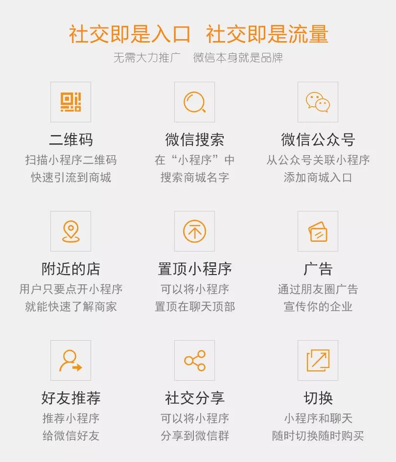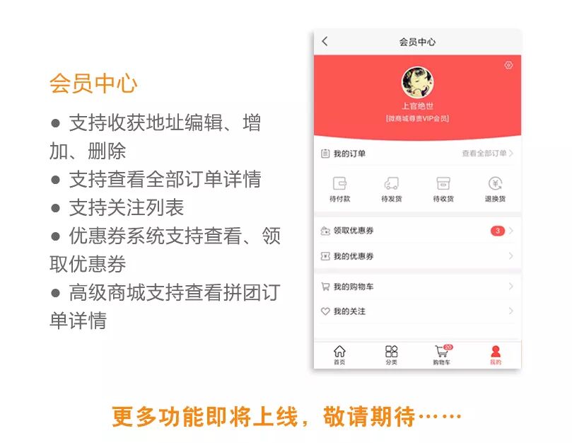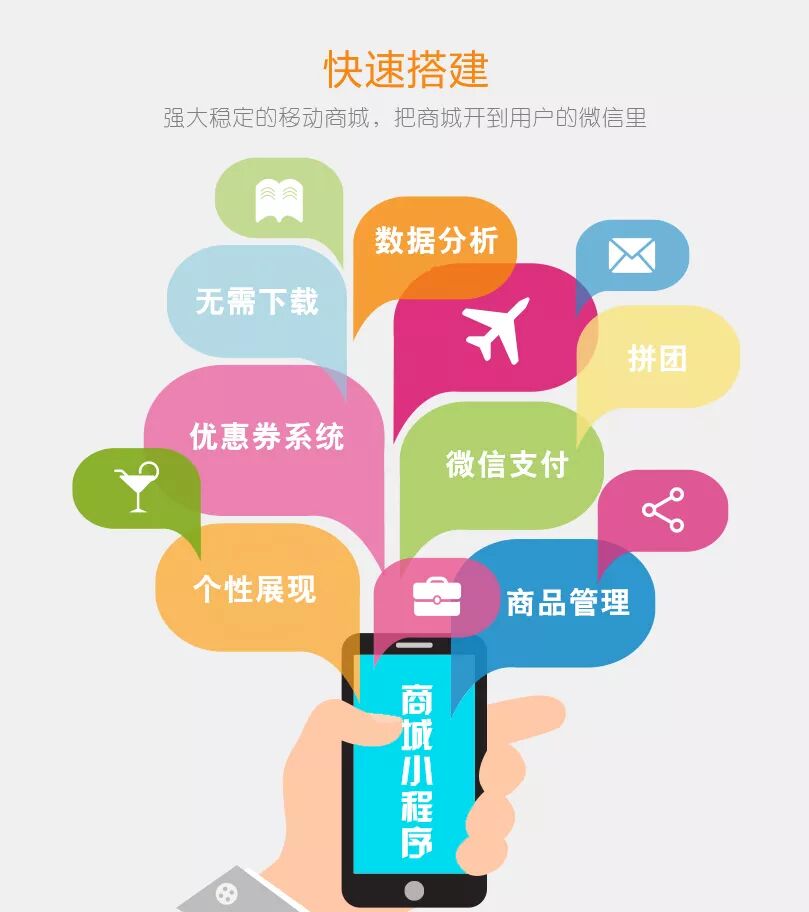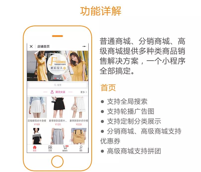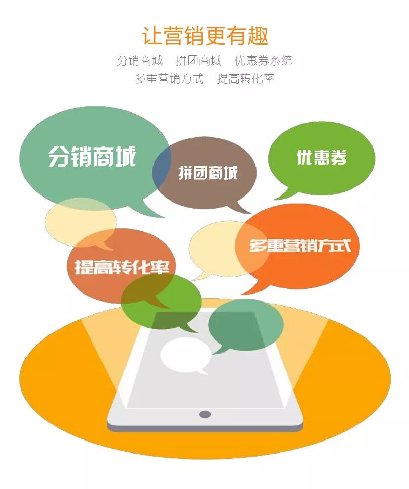 商城、三级分销、推广海报、财务系统、优惠券、微信客服、商户入驻、快速购买、秒杀、限时购、拼团、微网站、快递助手、物流助手、可生成手机独立App 等.