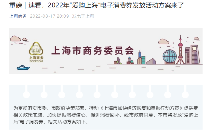 今日,上海市商务委员会宣布。将投入市级财政资金10亿,分三轮发放“爱购上海”电子消费券。具体金额为,第一轮投入2亿元,第二轮投入5亿元,第三轮投入3亿元。